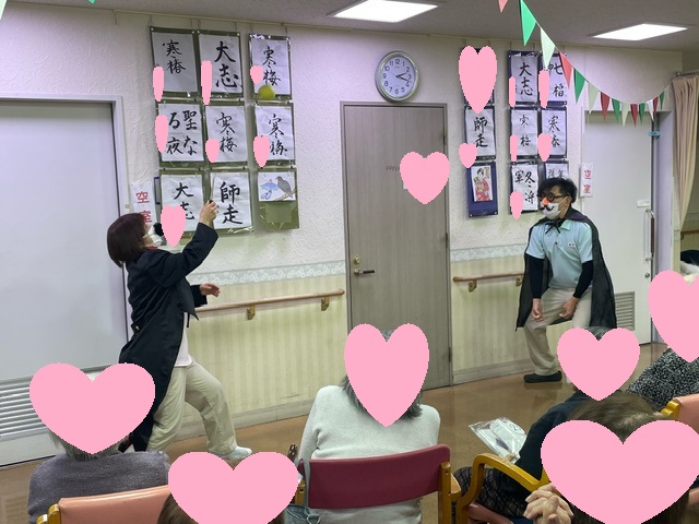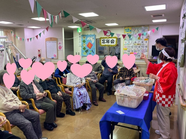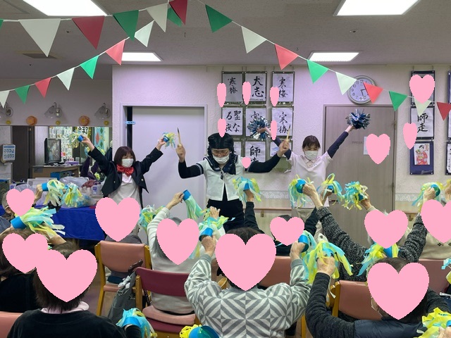 デイサービス帝塚山にて、「忘年会レク」を開催しました。 抽選会から始まりスタッフのマジックショー・ヒゲダンスを披露しました。 最後に皆様に手作りのポンポンを持っていただきスタッフと一緒にマツケンサンバを踊り盛り上がりました。 皆様「最後の日に楽しかった」と大変喜ばれておられました