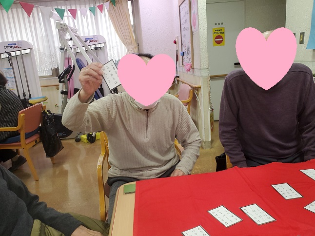 デイサービス帝塚山にて「百人一首」を行いました。 利用者様は、赤い毛氈を引いたテーブルから、スタッフの読み札を真剣に聞いて素早く取り札を取っておられました。 皆様「久しぶりに百人一首をやって楽しかった」と喜んでいただきました。