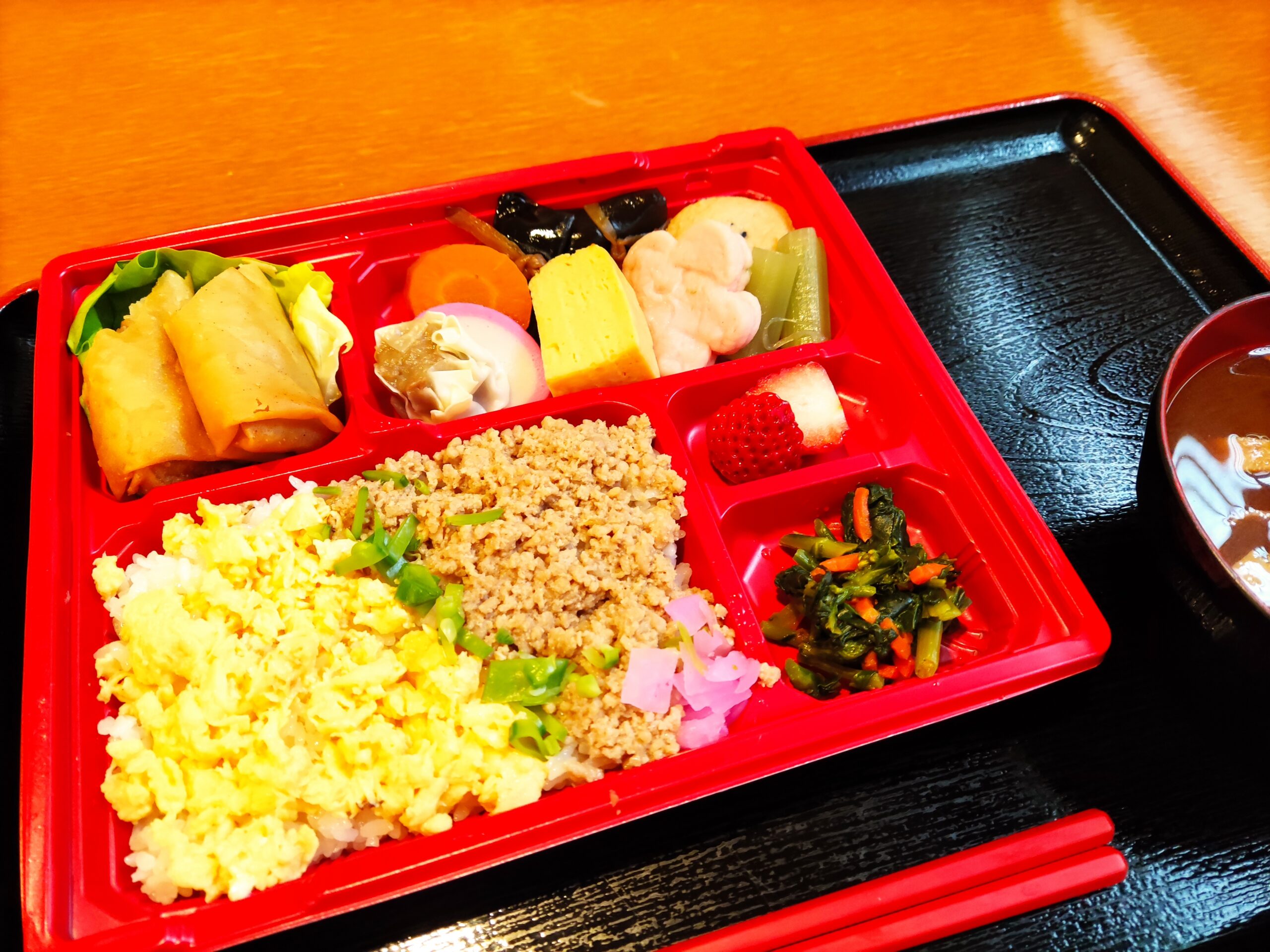 甘辛い醤油味のそぼろご飯が美味しいとの感想が多数の方からありました。 厚焼き玉子や焼売、春巻、いちごと、おかずも豊富で、食べ応えがあって満足ですとのうれしいお声をいただきました。