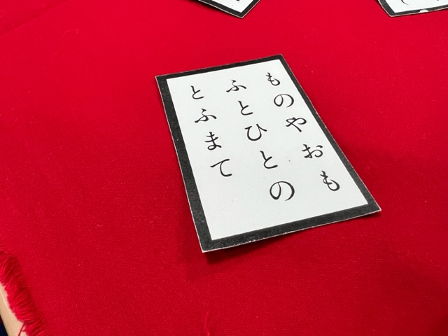 テーブルに赤い毛氈を引きスタッフの読み上げる上の句を聞いて、皆様下の句を思い出されながら取り札を真剣に探されておられ大いに盛り上がりました。
