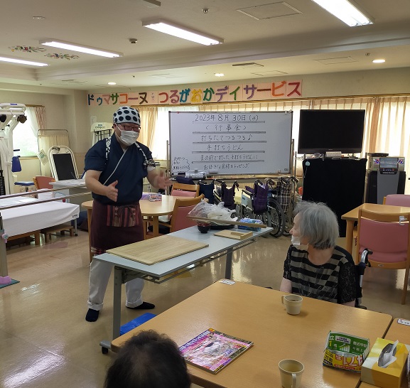 鶴ヶ丘デイサービスの行事食イベントにて「手打ちうどん」を実施しました。 本場讃岐うどんを修行された方に、麺うちからうどん教室までして頂き、ご利用者様と一緒にうどんを作って頂きました。 天婦羅・稲荷寿司と一緒に皆様も大変満足して頂き好評でした。